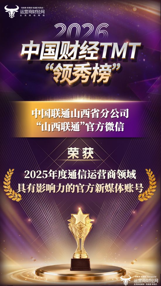运营商财经网讯 1月29日,运营商财经网举办了2026中国财经TMT"领秀榜"盛典,得到了包括运营商集团公司、省公 司、专业公司、研究院、地市公司在内的广泛关注和积极参与。 (责任编辑:张运迪) 盛典期间,运营商财经网公布了年度评选的获奖名单,涵盖了运营商、通信、互联网、金融、汽车、房 地产、手机数码、家电、家居、酒业、食品快消等领域的优秀企业及优秀产品。 其中,"山西联通"官方微信,斩获"2025年度通信运营商领域具有影响力的官方新媒体账号"奖项。 ...
