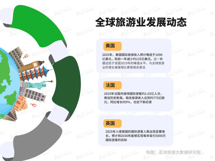 本文来自微信公众号"空间秘探",作者:ABNData,36氪经授权发布。 1月亚洲(中国)文旅综述 01 全球旅游业发展动态 1月,联合国旅游组织预测,在经历了过去三年的高速增长后,2026年全球旅游业增速将有所回落,总体预计维持 在3%—4%的区间,但总体增长的态势不会改变。相关专家指出,伴随着全球经济的发展,消费者信心指数持续 上升,将对旅游业带来积极影响。与此同时,米兰冬奥会、美加墨男足世界杯等重大体育赛事的举办,也将为 2026年的全球旅游市场发展注入新的动力。 美国方面,世界旅游及旅行理事会(WTTC)1月的报告显示,2025年美国国际游客消费额预计锐减125亿美元。 在WTTC与牛津经济研究院分析的184个国家中,美国是唯一一个去年国际游客消费额预测出现负增长的国家。国 际旅游行业媒体Skift网站报道,去年的一项调查显示,46%的受访游客因特朗普政府的相关政策降低了赴美意 愿。2025年,美国国际旅游收入预计略低于1690亿美元,较前一年减少约125亿美元。这一数据不仅远低于该国 2019年的峰值水平,与全球旅游业的增长速度相比更是相去甚远。旅游业的下滑带来的经济影响不止于旅游消费 本身,依赖国 ...
