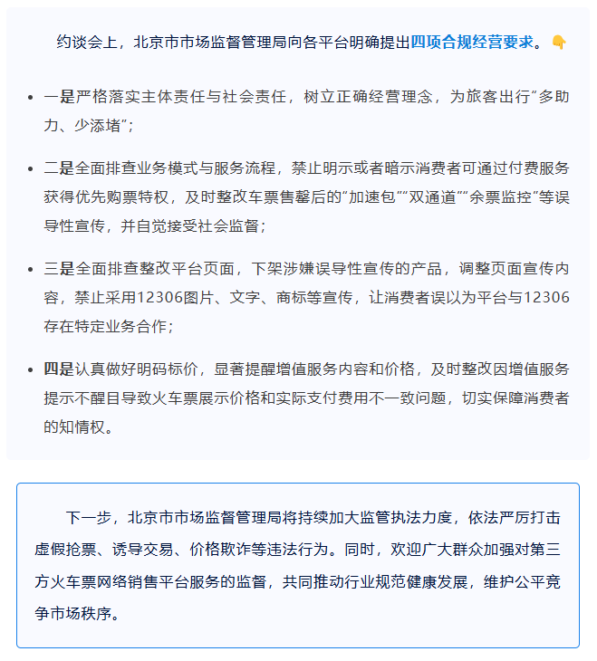 Core Viewpoint - The Beijing Municipal Market Supervision Administration has held an administrative meeting with 12 major platforms involved in online train ticket sales to address significant consumer complaints regarding ticket sales practices [1][2]. Group 1: Compliance Requirements - Platforms are required to strictly implement their responsibilities and adopt a correct business philosophy to facilitate travel for passengers [1]. - A comprehensive review of business models and service processes is mandated, prohibiting misleading promotions such as "accelerated packages" and "dual channels" that suggest consumers can gain priority access through paid services [1]. - Platforms must remove misleading promotional products from their pages and adjust content to avoid implying a partnership with the official ticketing platform 12306 [1]. - Clear pricing must be established, with prominent reminders of additional service costs to ensure transparency in ticket pricing [1]. Group 2: Regulatory Actions - The Beijing Municipal Market Supervision Administration plans to intensify regulatory enforcement against fraudulent ticketing, inducement transactions, and price deception [2]. - The administration encourages public oversight of third-party train ticket sales platforms to promote healthy industry development and maintain fair market competition [2].