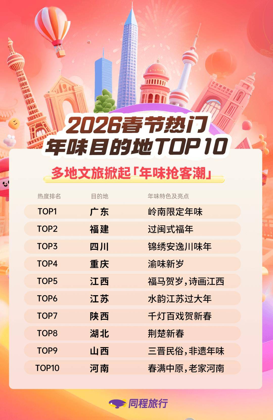 春节临近,今年"史上最长春节假期"叠加"请5休15"拼假小浪潮,积极提振新春文旅市场活跃度。1月27日,同程旅行发布《2026年春节旅行趋势报告》, 春节机票、酒店民宿、跟团游等主要产品预订热度不断走高。除了假期首尾客流高峰外,节中也将掀起多个出行高峰,大年初二、初三是游客们集中开启 新旅程的峰值时段。 | TOP7 | 陕西 | 千灯百戏贺新春 | | --- | --- | --- | | TOP8 | 湖北 | 荆楚新春 | | TOP9 | 山西 | 三晋民俗,非遗年味 | | TOP10 | 河南 | 春满中原,老家河南 | | | ○ 同程旅行 | | 春节热门"年味"目的地 广东、福建、四川等地年味浓 顺应"追寻年味"的主流趋势,广东、福建、四川等多地文旅纷纷掀起"年味抢客潮"。同程旅行数据显示,广东省主打岭南限定年俗,启动"2026请到广东 过大年"系列文旅主题活动。截至1月27日,广东省春节酒店预订热度较去年春节同期增长169%,其中广州以迎春花市、烟花汇演等吸引大波客流,春节 机票预订热度排在全国TOP5;清远市春节酒店预订热度同比上涨342%,涨幅在全国一众城市里排到第6名;揭阳市和汕头 ...