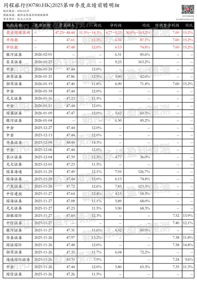 截至2026年02月25日,根据朝阳永续季度业绩前瞻数据: 1. 同程旅行第四季度业绩预期怎么样? 预测营业收入47.23~48.44亿元,同比增长11.5%~14.3%;预测净利润4.77~9.23亿元,同比增长 36.0%~163.2%;预测经调整净利润7.60亿元,同比变动15.2%。 来源:朝阳永续 关注后续财报数据披露后能否超预期,朝阳永续港股季度业绩前瞻数据将为投资者提供业绩鉴定。 分业务来说: 1)艺龙酒店科技:已成为新增长引擎,复用集团供应链优势,精准切中存量翻改痛点,Pipeline达1500 家,跻身行业第一梯队。 2)收购万达酒管:增厚利润,掌握国牌高端定价权和设计建设能力,与艺科形成错位互补,共同驱动轻 资产业务估值重塑。 国盛证券认为:同程旅行作为在线旅游旗舰,由同程网络和艺龙合并而成,依托腾讯和携程的资源,实 现快速发展,年付费用户超2.5亿。公司业绩稳步增长,2025年前三季度收入、归母净利、经调利润均 实现同比增长。同程旅行在OTA市场中占据重要地位,聚焦下沉市场,积极拓展多渠道流量,推动用户 价值提升,实现量价齐升。公司积极布局产业链延展,有望在后续贡献增量。预计2025-2 ...