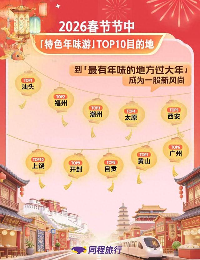 转自:扬子晚报 阖家团圆的热闹尚未散去,一场跨越大江南北的旅游热潮已悄然掀起。同程旅行数据显示,春节九天长 假让"分段式过年"更加火爆,2月18日(大年初二)至2月19日(大年初三)成为节中出游高峰时段,节 中民航出行热度较去年春节同期提升38%。从整个春节假期来看,民航2次以上出行旅客同比涨幅预计 达一半以上。今年是春节申遗成功后第二个"非遗中国年"。汕头、福州、太原等一批年俗年味独特、沉 浸式体验强的目的地突出重围,热门景区门票预约及入园客流维持高位。 "特色年味游"目的地 汕头领跑全国"特色年味游"热门目的地 太原以社火巡游、非遗展演等丰富民俗活动成为游客找寻年味的热门去处,春节假期前半段,太原武宿 机场进港机票热度环比上月增长268%。大年初一至初五,老君山景区、黄山风景区、自贡中华彩灯大 世界、葛仙村度假区等景区门票预约及入园客流持续处于高位,"2大1小"和"2大2小"的家庭组合门票订 单最为常见。 国内机票热门目的地 经典目的地仍是"客流担当" 作为全岛封关运作后的首个春节,海南省文旅市场热度"火力全开"。同程旅行平台数据显示,春节假期 前半段,海口美兰机场、三亚凤凰机场进港机票热度环比上月涨超3 ...