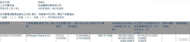 | 麦植座长 | 次股東/董庫/嚴重信貸入債各 作出該購的賣人 / 費出或涉及时 每月的平均價 | | | 耗有權益的股份數量 佔已發行的商職單作的目 相關活黨股 賣權值得益 | | --- | --- | --- | --- | --- | | | 200 1955 100 - | | | (得参閲上述*註 南投票個發期(日/月/ 份權益 | | | | | | 团周分比 年) | | CS20251114E00460 UPMorgan Chase & Co. | 1101(L) | 17.319.839(L) | HKD 11,1430 | 193,530,128(L) 10.11(L)(11/11/2025 | | | 14015(S) | 4.172,432(S) | | 153,930,160(S) 8.04(S) | | | | | | 6,883,358(P) 0.35(P) | 格隆汇11月18日丨根据联交所最新权益披露资料显示,2025年11月11日,微创医疗(00853.HK)获 JPMorgan Chase & Co.以每股均价11.143港元增持好仓1731.98万股,涉资约1.93亿 ...