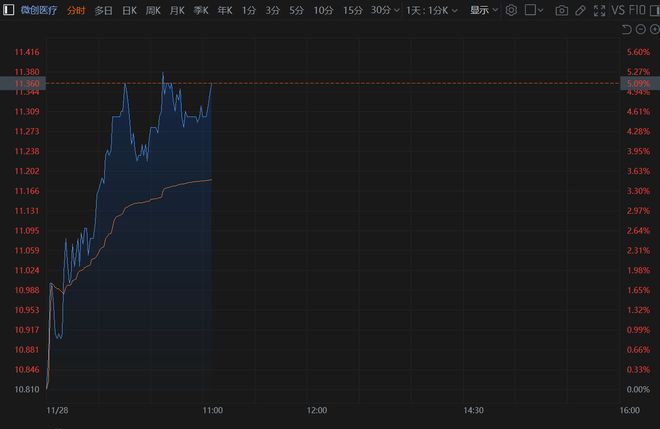 Group 1 - MicroPort Medical (00853.HK) saw a morning increase of over 4%, currently up 4.53% at HKD 11.3 [1] - The trading volume reached HKD 80.5031 million [1]
