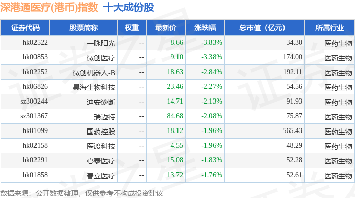 12月24日深港通医疗(港币)(983036)指数涨0.28%,成份股微创医疗(00853)领涨