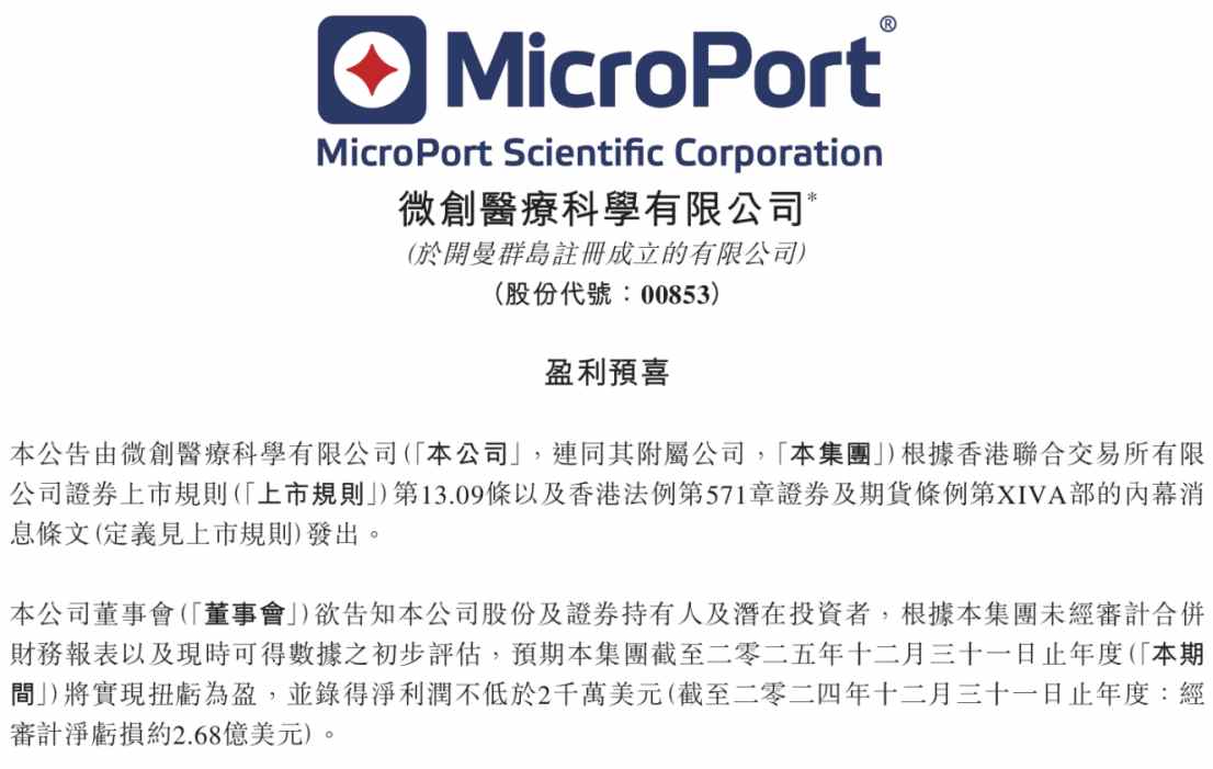 微创医疗:2025 财年盈利预警:业绩大幅超预期