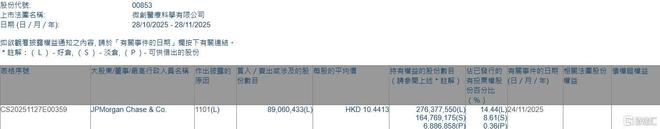 Core Insights - JPMorgan Chase & Co. increased its stake in MicroPort Scientific Corporation (00853.HK) by acquiring 89.0604 million shares at an average price of HKD 10.4413 per share, totaling approximately HKD 930 million [1] - Following this acquisition, JPMorgan's total holdings in MicroPort rose to 276,377,550 shares, increasing its ownership percentage from 9.79% to 14.44% [1] Company Summary - MicroPort Scientific Corporation is a publicly listed company on the Hong Kong Stock Exchange, identified by the stock code 00853 [2] - The recent transaction indicates a significant investment by JPMorgan, reflecting confidence in MicroPort's future performance and potential growth [1][2]