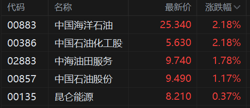 | 代码 | 名称 | 最新价 涨跌幅 × | | | --- | --- | --- | --- | | 00883 | 甲国海洋石油 | 25.340 2.18% | | | 00386 | 中国石油化工股 | 5.630 | 2.18% | | 02883 | 中海油田服务 | | 9.740 1.78% | | 00857 | 中国石油股份 | 9 490 | 1.17% | | 00135 | 昆仑能源 | 8.210 | 0.37% | 港股石油股持续活跃,其中,中国海洋石油、中国石油化工均涨超2%,且中石化刷新上市新高价,中 海油田服务涨1.8%,中国石油股份涨超1%,昆仑能源跟涨。 消息上,由于交易员关注的重点在于美伊紧张局势,且该因素掩盖了供应增加的信号,原油价格维持涨 势。WTI原油稳定在每桶65美元附近。此前,该原油价格在周三上涨超过1%。尽管特朗普在与内塔尼 亚胡就该地区局势进行会谈后发表评论,表示其目标是与德黑兰达成协议,但交易员仍对潜在的军事打 击和供应风险感到担忧。国际能源署定于周四晚些时候发布月度市场展望报告,该报告可能再次指出全 球供应过剩的问题。 ...