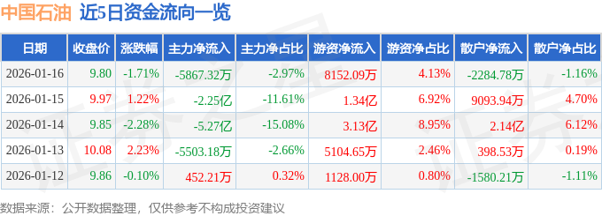 证券之星消息,截至2026年1月16日收盘,中国石油(601857)报收于9.8元,下跌1.71%,换手率0.12%, 成交量200.68万手,成交额19.73亿元。 近5日资金流向一览见下表: | 日期 | | | | | 收盘价 涨跌幅 主力净流入 主力净占比 游资净占比 散户净流入 散户净占比 | | | | | --- | --- | --- | --- | --- | --- | --- | --- | --- | | 2026-01-16 | 9.80 | -1.71% | -5867.32万 | -2.97% | 8152.09万 | 4.13% | -2284.78万 | -1.16% | | 2026-01-15 | 9.97 | 1.22% | -2.25 Z | -11.61% | 1.34亿 | 6.92% | 9093.94万 | 4.70% | | 2026-01-14 | 9.85 | -2.28% | -5.27亿 | -15.08% | 3.13亿 | 8.95% | 2.14亿 | 6.12% | | 2026-01-13 | 10.08 | 2.23% | -5503.1 ...