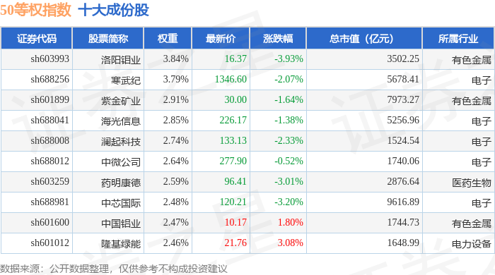 资金流向方面,50等权(000050)指数成份股当日主力资金净流出合计29.79亿元,游资资金净流入合计 11.81亿元,散户资金净流入合计17.98亿元。成份股资金流向详情见下表: | 代码 | 名称 | 主力净流入(元) | 主力净占比 游资净流入 (元) | | 游资净占比 散户净流入(元) | | 散户净占比 | | --- | --- | --- | --- | --- | --- | --- | --- | | 600036 招商银行 | | # 4.33 Z | 11.29% | -2.98亿 | -7.76% | -1.35 Z | -3.52% | | 601857 | 中国石油 | 3.26 Z | 14.97% | 360.76万 | 0.17% | -3.30 Z | -15.14% | | 601012 隆基绿能 | | 2.97 | 4.75% | 4303.19万 | 4 0.69% | -3.40 Z | -5.44% | | 600150 | 中国船舶 | 2.84亿 | 10.31% | -1.30亿 | -4.71% | -1.54亿 | -5.60% | | 60108 ...