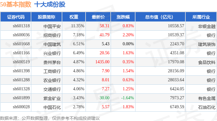 资金流向方面,50基本(000052)指数成份股当日主力资金净流出合计29.79亿元,游资资金净流入合计 11.81亿元,散户资金净流入合计17.98亿元。成份股资金流向详情见下表: 证券之星消息,11月3日,50基本(000052)指数报收于2972.53点,涨0.78%,成交1346.37亿元,换手 率0.32%。当日该指数成份股中,上涨的有30家,中国石油以4.48%的涨幅领涨,下跌的有19家,洛阳钼 业以3.93%的跌幅领跌。 50基本(000052)指数十大成份股详情如下: | 证券代码 | 股票简称 | 权重 | 最新价 | 涨跌幅 | 总市值(亿元) | 所属行业 | | --- | --- | --- | --- | --- | --- | --- | | sh601318 | 中国平安 | 11.35% | 58.31 | 0.83% | 10558.57 | ■ 非银金融 | | sh600036 | 招商银行 | 7.18% | 41.79 | 2.20% | 10539.37 | → 银行 | | sh601668 | 中国建筑 | 6.51% | 5.43 | 0.00% | 224 ...