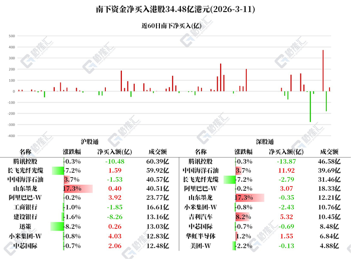 格隆汇3月11日|南下资金今日净买入港股34.48亿港元。其中: 净买入中国海洋石油10.39亿、阿里巴巴-W 6.98亿、吉利汽车5.31亿、小米集团-W 1.59亿、华虹半导体 1.55亿、中芯国际1.37亿; | 南下资金净买入港股34.48亿港元(2026-3-11) | | --- | | | 产股通 | | | 深度通 | | | | | --- | --- | --- | --- | --- | --- | --- | --- | | 名称 | 深跌幅 | 净买入额(亿) | 成交额 | 名称 | 涨跌幅 | 净买入额(亿) | 成交割 | | 腾讯控股 | +0.3% | -10.48 | 60.39 Z | 腾讯控股 | -0.3% | -13.87 | 46.58 Z | | 长飞光纤光缆 | +7.2% | 1.59 | 59.92 65 | 中国海洋行油 | 3.7% | 11.92 | 39.69 6 | | 中国游平石油 | 3.7% | -1.53 | 40.57 Z | 长飞光纤光缆 | -7.2% | -2.79 | 31.46 Z | | 山东零龙 | 17.3% | 0. ...