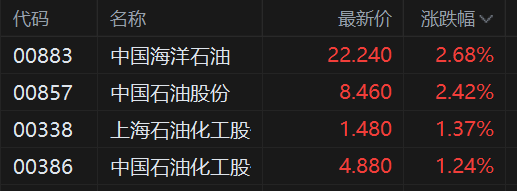 港股异动丨三桶油拉升 中海油涨近3% 中石化创阶段新高