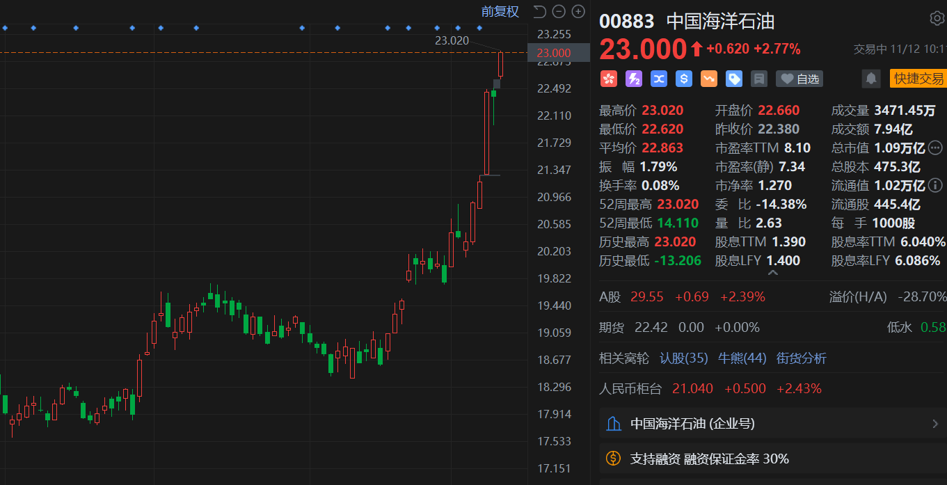 港股异动丨中国海洋石油涨约3%创新高 月内累计升幅超16% 获南下资金持续买入