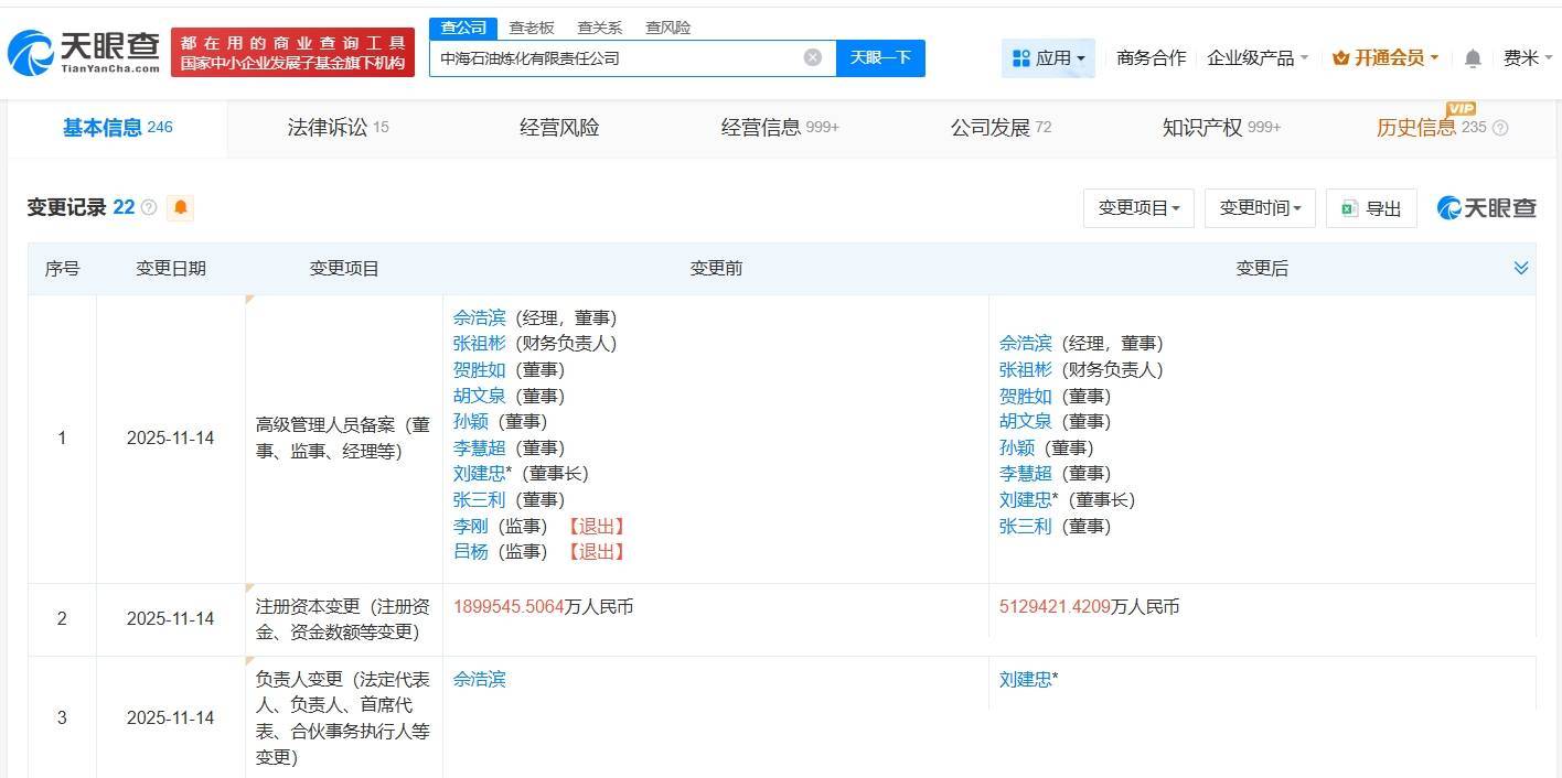 查冈险 查老板 音关系 四六届 都在用的 商业 查 询 工 具 中海石油炼化有限责任公司 天眼一下 商务合作 1 8 品 应用 ▼ 国家中小企业发展子基金旗下机构 基本信息 246 法律诉讼 15 经营风险 经营信息 999+ 公司发展 72 知识 股东信息 2 ● 器 股权结构 股东信息 1 股权变更历程32 序号 持股比例 ÷ 股东名称 认缴出资额(万元) ÷ 认缴出资 中国海洋石油集团有限公司 品 1 100% @ 5129421.4208 控股股东 圆 央企 | | | 都在用的商业商间丁具 | 查公司 章老板 章关系 查风险 | | | | | | --- | --- | --- | --- | --- | --- | --- | --- | | | | 国家中小企业发展子其全旗下机构 | 中零石油烯化有限责任公司 | 8 | 天眼一下 | 脂 应用 ▼ | 商务合作 : | | 基本信息 246 | | 法律诉讼 15 | 经营风险 | 经营信息 999+ | | 公司发展 72 | 知识 | | 变更记录 22 0 ● | | | | | | 变更项目, | | | 序号 | 变更目期 | 变更 ...
