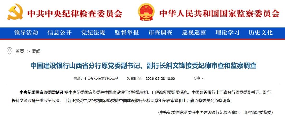 北京商报讯(记者 孟凡霞 周义力)2月28日,中央纪委国家监委网站消息,据中央纪委国家监委驻中国 建设银行纪检监察组、山西省纪委监委消息:中国建设银行山西省分行原党委副书记、副行长斛文锋涉 嫌严重违纪违法,目前正接受中央纪委国家监委驻中国建设银行纪检监察组纪律审查和山西省监察委员 会监察调查。 ...