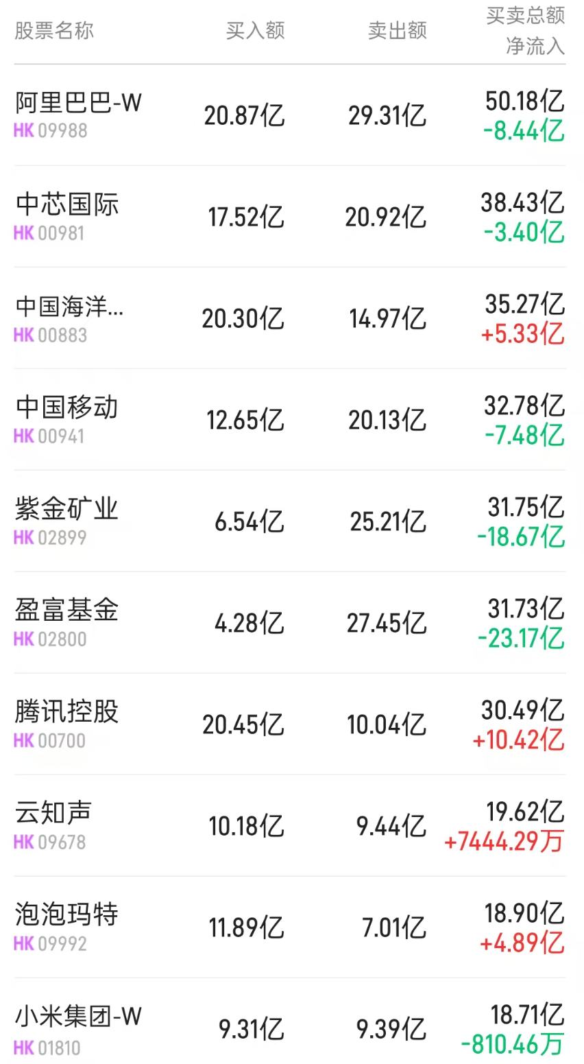 1月27日,南下资金净卖出港股6.35亿港元,为连续第三日净卖出。 其中:净买入腾讯控股10.24亿、中国人寿5.11亿、长飞光纤光缆3.54亿、中国海洋石油3.12亿;净卖出中国移动11.47亿、紫金矿业8.42亿、中芯国际5.52 亿、阿里巴巴-W 4.01亿、华虹半导体1.91亿、招金矿业1.45亿、紫金黄金国际1.33亿。 据统计,南下资金已连续5日净买入中海油,共计14.0858亿港元;连续3日净买入腾讯,共计22.7903亿港元;连续17日净卖出中国移动,共计140.4003亿港 元;连续3日净卖出阿里巴巴,共计21.2684亿港元。 | | 沪股通 | | | | | --- | --- | --- | --- | --- | | 名称 | 涨跌幅 | 净买入额(亿) | 成交额 | 名称 | | 阿里巴巴-W | 2.9% | -0.57 | 47.26 Z | 阿里巴巴-W | | 腾讯控股 | 1.3% | 8.69 | 33.88 Z | 腾讯控股 | | 中国移动 | -0.4% | -15.93 | 26.36 Z | 中芯国际 | | 中芯国际 | 1.4% | -0.86 | 2 ...