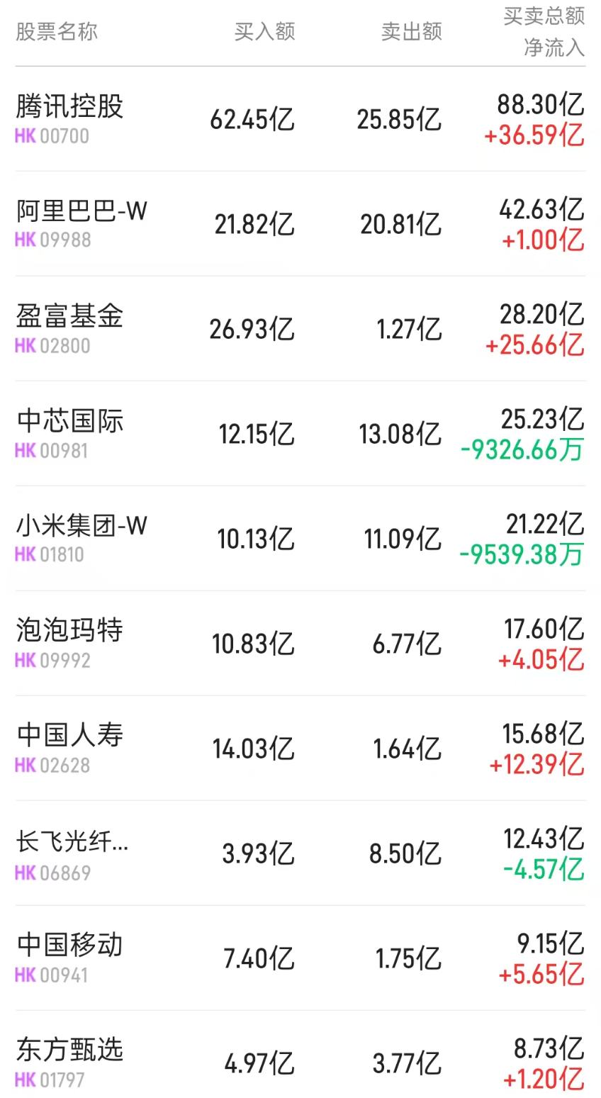 沪港通(南向)十大活跃成交公司 | 公司名称 | 成交金额 | 净买入额 | | --- | --- | --- | | 腾讯控股(00700) | 88.30 亿元 | +36.59 亿元 | | 阿里巴巴-W(09988) | 42.63 亿元 | +1.00 亿元 | | 盈富基金(02800) | 28.20 亿元 | +25.66 亿元 | | 中芯国际(00981) | 25.23 亿元 | -9326.66 万元 | | 小米集团-W(01810) | 21.22 亿元 | -9539.38 万元 | | 泡泡玛特(09992) | 17.60 亿元 | +4.05 亿元 | | 中国人寿(02628) | 15.68 亿元 | +12.39 亿元 | | 长飞光纤光缆(06869) | 12.43 亿元 | -4.57 亿元 | | 中国移动(00941) | 9.15 亿元 | +5.65 亿元 | | 东方甄选(01797) | 8.73 亿元 | +1.20 亿元 | 深港通(南向)十大活跃成交公司 | 公司名称 | 成交金额 | 净买入额 | | --- | --- | --- | | ...