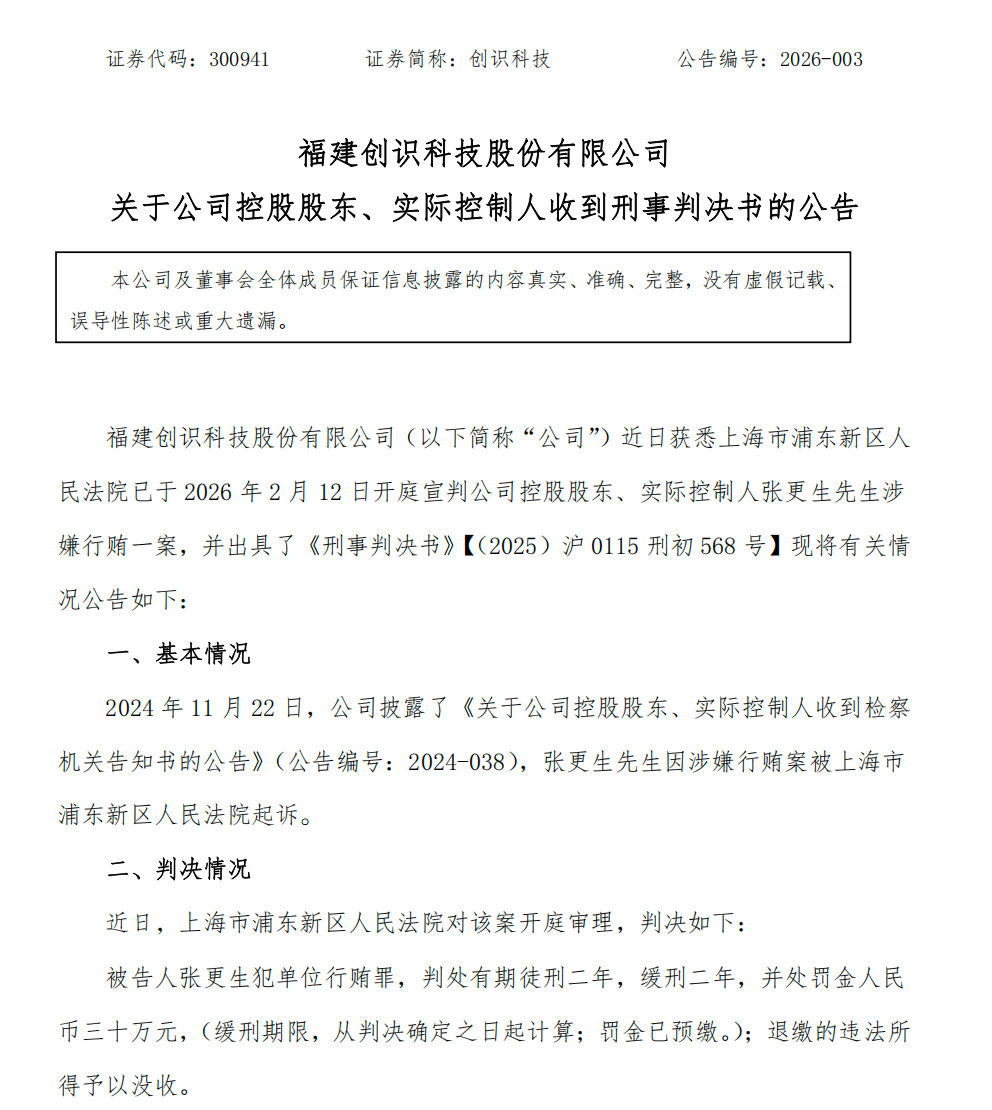 2月13日晚间,创识科技(300941)发布公告称,公司控股股东、实际控制人张更生因犯单位行贿罪,被法院一审判处有期徒刑二年,缓刑二 年,并处罚金30万元。 【导读】创识科技实控人张更生被判有期徒刑二年,缓刑二年 资料显示,张更生出生于1964年,他于20世纪90年代起参与创立创识科技,并长期担任公司董事长、总经理职务,以及兼任多家子公司董 事。 2024年11月22日,因涉及公司董事黄忠恒行贿案,张更生被上海市浦东新区人民法院起诉。 2025年5月,张更生因个人原因辞去董事及董事长职务。同年12月22日,创识科技收到邹平市监察委员会签发的《立案通知书》和《留置通知 书》,张更生被立案调查并实施留置措施。 最新公告显示,上海市浦东新区人民法院已于2026年2月12日开庭宣判张更生涉嫌行贿一案。判决如下: 被告人张更生犯单位行贿罪,判处有期徒刑二年,缓刑二年,并处罚金人民币30万元;退缴的违法所得予以没收。 创识科技表示,截至目前,公司控股股东、实际控制人张更生未在公司担任董事、高级管理人员职务,上述判决不影响实际控制人的股东权 利行使,罚没及罚金已由其个人全部缴纳,不会对公司的生产经营产生重大不利影响。 创识 ...