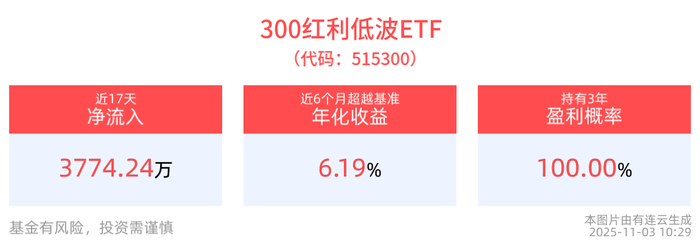 截至2025年11月3日 10:29,沪深300红利低波动指数上涨0.58%,成分股宝钢股份上涨2.44%,建设银行 上涨2.30%,上海银行上涨2.11%,江苏银行上涨1.95%,中信银行上涨1.94%。300红利低波 ETF(515300)上涨0.45%。 流动性方面,300红利低波ETF盘中换手0.92%,成交4338.27万元。规模方面,300红利低波ETF最新规 模达47.04亿元。资金流入方面,拉长时间看,300红利低波ETF近17个交易日内有9日资金净流入,合 计"吸金"3774.24万元。 截至10月31日,300红利低波ETF近5年净值上涨60.44%,指数股票型基金排名92/1032,居于前8.91%。 从收益能力看,截至2025年10月31日,300红利低波ETF自成立以来,最高单月回报为13.89%,最长连 涨月数为5个月,最长连涨涨幅为14.56%。截至2025年10月31日,300红利低波ETF近6个月超越基准年 化收益为6.19%。 中国上市公司协会日前发布中国上市公司2025年三季报经营业绩报告。截至10月31日,全市场共1033家 上市公司公布一季度、半年度、三季度现金分红预 ...