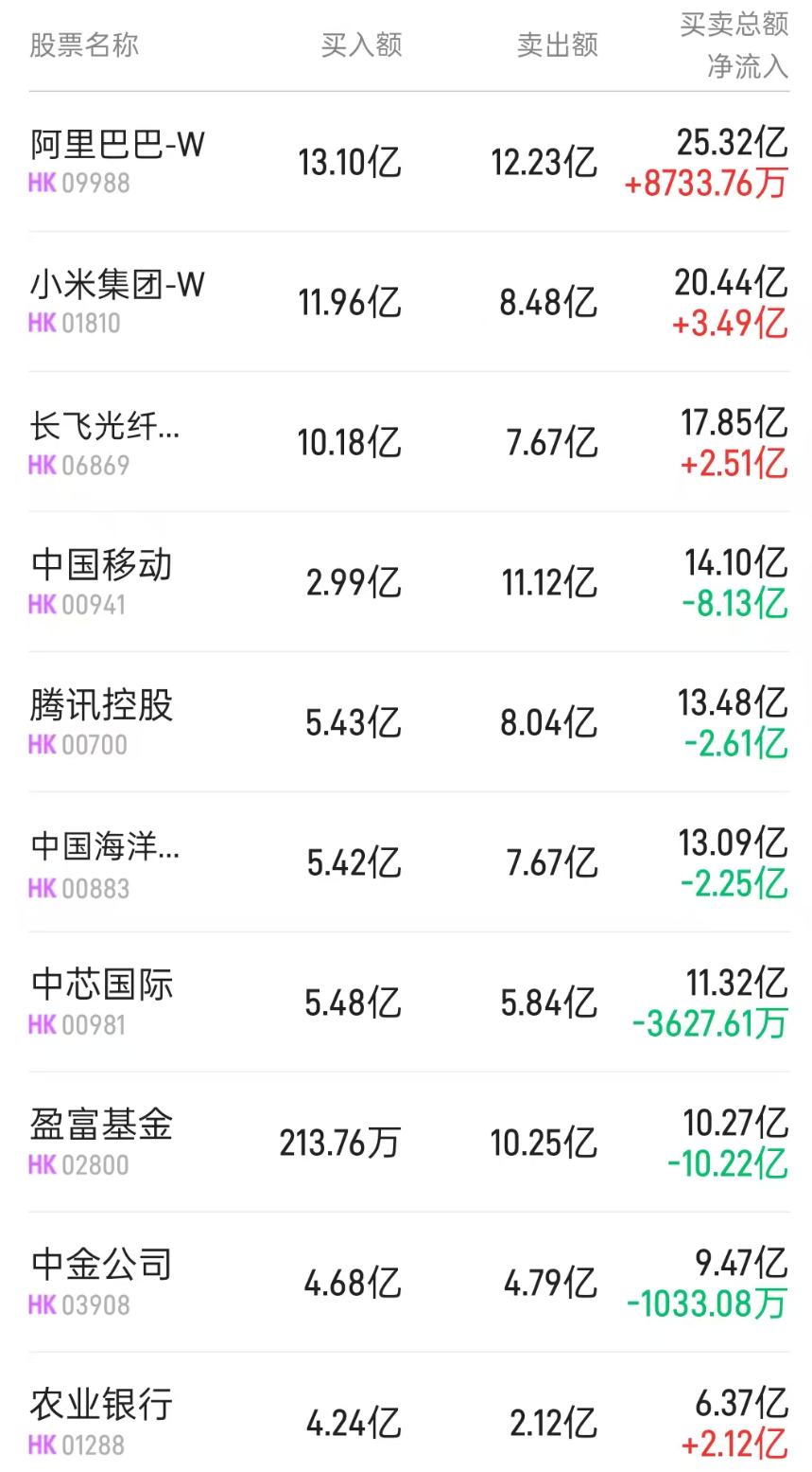 图解丨南下资金净卖出中国移动12.9亿,净买入小米9亿