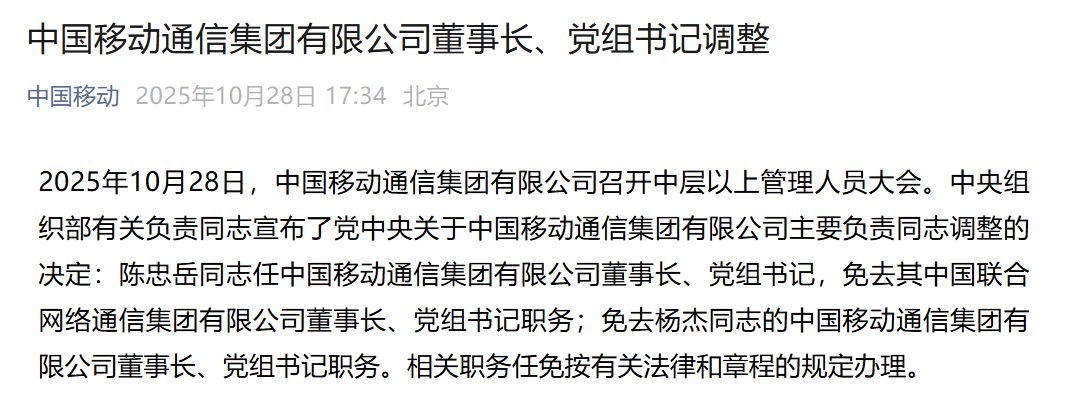 10月28日,中国移动发布公告称,2025年10月28日,中国移动通信集团有限公司召开中层以上管理人员 大会。中央组织部有关负责同志宣布了党中央关于中国移动通信集团有限公司主要负责同志调整的决 定:陈忠岳同志任中国移动通信集团有限公司董事长、党组书记,免去其中国联合网络通信集团有限公 司董事长、党组书记职务;免去杨杰同志的中国移动通信集团有限公司董事长、党组书记职务。 ...