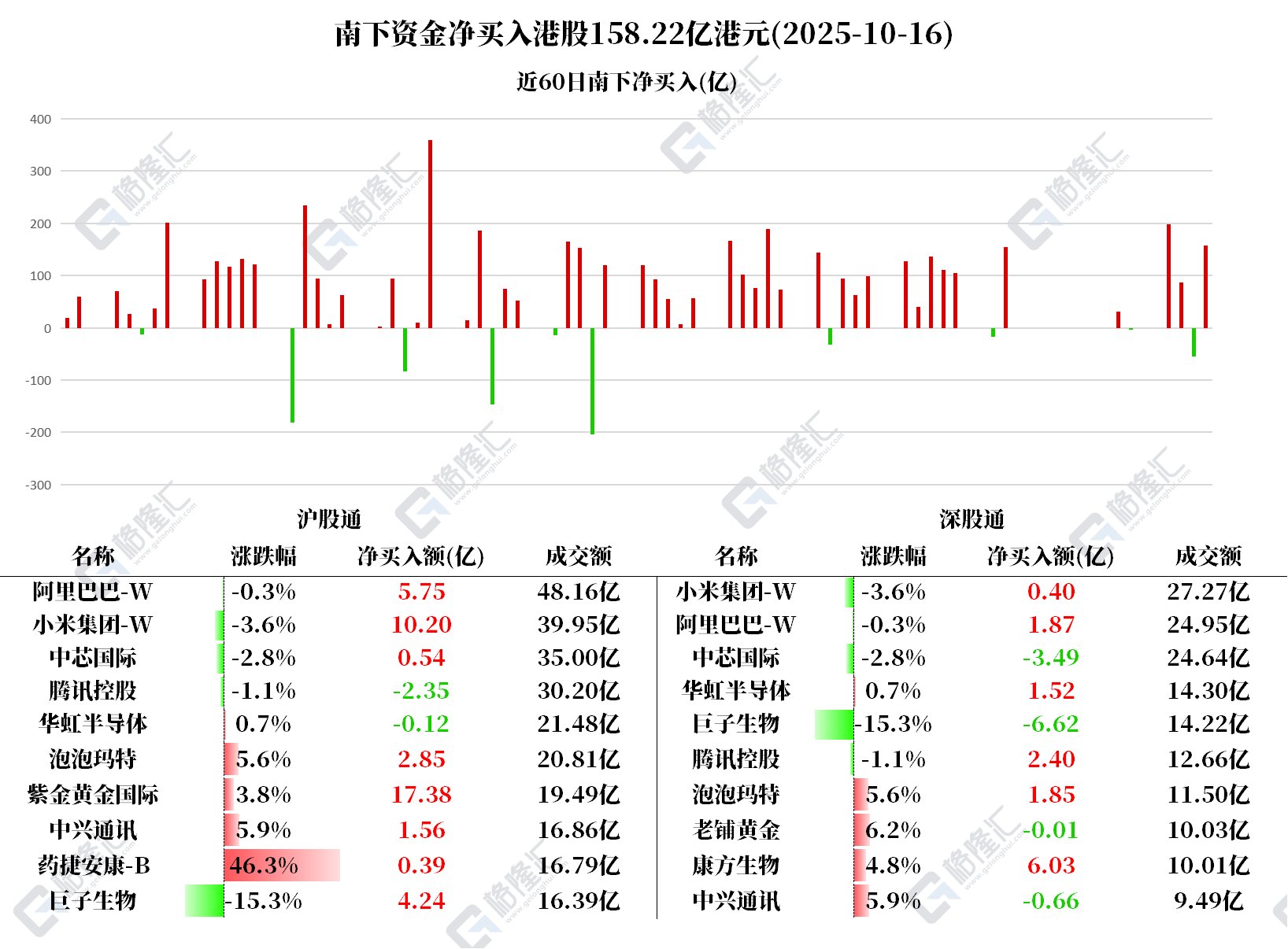 据统计,南下资金已连续9日净买入小米,共计69.8844亿港元;连续6日减持中芯国际,共计75.2365亿港元。(格隆汇) 格隆汇10月16日|南下资金今日净买入港股158.22亿港元。其中: 净买入紫金黄金国际17.38亿、小米集团-W 10.6亿、阿里巴巴-W 8.57亿、康方生物6.02亿、泡泡玛特4.7亿、华虹半导体1.4亿; 净卖出中芯国际2.94亿、巨子生物2.37亿。 | | 沪股通 | | | | | --- | --- | --- | --- | --- | | 名称 | 涨跌幅 | 净买入额(亿) | 成交额 | 名称 | | 阿里巴巴-W | -0.3% | 5.75 | 48.16亿 | 小米集团-W | | 小米集团-W | -3.6% | 10.20 | 39.95 Z | 阿里巴巴-W | | 中芯国际 | -2.8% | 0.54 | 35.00亿 | 中芯国际 | | 腾讯控股 | -1.1% | -2.35 | 30.20亿 | 作汇非营体 | | 华虹半导体 | 0.7% | -0.12 | 21.48 Z | 巨子生物 | | 泡泡玛特 | 5.6% | 2.85 | ...