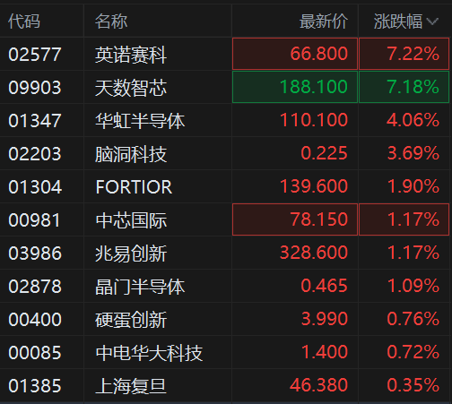 | 代码 | 名称 | 最新价 | 涨跌幅 √ | | --- | --- | --- | --- | | 02577 | 英诺塞科 | 66.800 | 7.22% | | 09903 | 天数智芯 | 188.100 | 7.18% | | 01347 | 华虹半导体 | 110.100 | 4.06% | | 02203 | 脑洞科技 | 0.225 | 3.69% | | 01304 | FORTIOR | 139.600 | 1.90% | | 00981 | 中芯国际 | 78.150 | 1.17% | | 03986 | 兆易创新 | 328.600 | 1.17% | | 02878 | 晶门半导体 | 0.465 | 1.09% | | 00400 | 硬蛋创新 | 3.990 | 0.76% | | 00085 | 中电华大科技 | 1.400 | 0.72% | | 01385 | ┣適負日 | 46.380 | 0.35% | 国信证券最新研报指出,半导体景气超预期,多环节陆续提价,AI眼镜放量在即。继续推荐周期复苏 的模拟芯片企业纳芯微等,及晶圆代工企业中芯国际、华虹半导体等。 港 ...