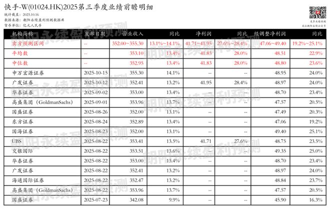 截至2025年10月16日,根据朝阳永续季度业绩前瞻数据: 1. 快手-W第三季度业绩预期怎么样? 预测公司Q3营业收入352.00~355.30亿元,同比增长13.1%~14.1%;预测Q3净利润41.71~41.95亿元,同 比增长27.6%~28.4%;预测Q3经调整净利润47.06~49.40亿元,同比增长19.2%~25.1%。 关注后续财报数据披露后能否超预期,朝阳永续港股季度业绩前瞻数据将为投资者提供业绩鉴定。 来源:朝阳永续 分业务来说: 1) 电商业务:GMV同比增长17.6%,泛货架电商GMV占比超过32%,短视频电商GMV同比增长超 30%。 2) 营销业务:外循环收入增长受内容消费、本地生活和汽车行业需求驱动,内循环通过迭代核心工具 提升商家营销素材投放稳定性。 3) 可灵AI:功能、场景和商业化持续升级,新功能灵动画布提升创作体验,应用场景扩展至广告营 销、影视短剧、游戏互动和智能硬件等,商业化收入超2.5亿元,预计2025年收入翻倍。 国海证券认为:快手-W在2025Q2季报中显示营收350.46亿元,同比增长13.1%,毛利率55.7%,净利润 49.22亿元,净利率14.0%, ...
