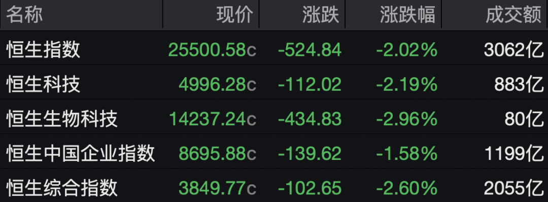3月19日,港股放量大跌,截至收盘,恒指跌2.02%,恒生科技指数跌2.19%,南向资金净买入逾260亿港元。 | 名称 | 现价 涨跌 | | 涨跌幅 | 成交额 | | --- | --- | --- | --- | --- | | 恒生指数 | 25500.58c -524.84 | -2.02% | | 3062亿 | | 恒生科技 | 4996.28c -112.02 | -2.19% | | 883亿 | | 恒生生物科技 | 14237.24c -434.83 | -2.96% | | 80亿 | | 恒生中国企业指数 8695.88c -139.62 -1.58% | | | | 1199亿 | | 恒生综合指数 | 3849.77c -102.65 | | -2.60% | 2055亿 | 大型科网股多数下跌,腾讯控股、快手大跌超6%,华虹半导体、哔哩哔哩跌超5%,阿里巴巴跌超4%,百度集团、中芯国际等跌超3%。 | 名称 | 涨跌幅 - | 现价 | 涨跌 | | --- | --- | --- | --- | | 腾讯音乐-SW | -8.05% | 41.120c | -3.600 | ...