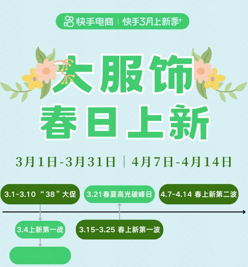 Core Insights - The article highlights the launch of the "Spring New Arrival" campaign by Kuaishou, aimed at boosting the apparel industry during the peak season for new product releases in March [1][3]. Group 1: Campaign Structure - The "Spring New Arrival" campaign is divided into three phases: the "38 Promotion" period before March 10, the first wave of spring new arrivals from March 15 to 25, and the second wave from April 7 to 14 [3]. - Key promotional events include the "38 Goddess Day" and "Spring/Summer Peak Day" to maximize consumer engagement and sales [3]. Group 2: Merchant Incentives - Kuaishou offers various incentives for merchants, including a direct discount activity where merchants can receive an additional 10%-12% subsidy from the platform upon meeting discount thresholds [8]. - Incentive types include full-cycle incentives for merchants with a single event capability of over 1 million, single-event incentives for those with over 200,000, and a "Red Packet Rain" for smaller merchants [5][6]. Group 3: Marketing Innovations - The campaign introduces a "New Clothing Show" feature, transforming traditional fashion shows into immersive live-streaming experiences to enhance marketing effectiveness [9][10]. - Merchants participating in the "New Clothing Show" will receive exclusive benefits, including tailored event planning and resource support [9]. Group 4: Short Video and Marketing Support - Kuaishou encourages merchants to create short videos around trending topics to gain exclusive traffic support, focusing on three key trends: "Self-Love Plus Size," "Urban Sports," and "New Chinese Style" [11][14]. - Merchants can also benefit from marketing management support for new products, including promotional boosts and exposure through competitive pricing strategies [13][14]. Group 5: Overall Strategy - The "Spring New Arrival" campaign is designed to leverage precise timing, multiple policy resources, and innovative marketing strategies to help apparel merchants capitalize on the spring shopping season [14].