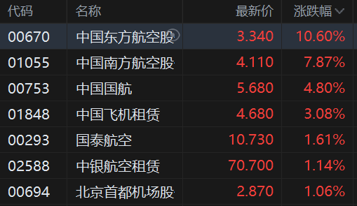 | 代码 | 名称 | 最新价 | 涨跌幅 ▽ | | --- | --- | --- | --- | | 00670 | 中国东方航空股2 | 3.340 | 10.60% | | 01055 | 中国南方航空股 | 4.110 | 7.87% | | 00753 | 中国国航 | 5.680 | 4.80% | | 01848 | 中国飞机租赁 | 4.680 | 3.08% | | 00293 | 国泰航空 | 10.730 | 1.61% | | 02588 | 中银航空租赁 | 70.700 | 1.14% | | 00694 | 北京首都机场股 | 2.870 | 1.06% | 港股航空股大幅拉升,其中,中国东方航空大涨10.6领衔,中国南方航空涨约8%,中国国航涨4.8%, 国泰航空涨1.6%。 消息上,中金指出,航司数据方面,根据Wind,10.1-10.7日国内航司日均客流量同比增长3%,平均单 价同比减少4%,对比五一假期(客运量同比增长13%,平均单价下滑9%)客运量同比增速收窄。 招商证券日前研报指出,今年以来板块总体走势较弱,关注Q4低基数下供需修复、"反内卷"政策及原 油增产等对 ...