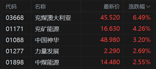 作为能源替代品,煤炭需求预期增强,纽卡斯尔煤炭期货价格在3月跳涨9.3%,触及每吨150美元。这 种外部冲击直接提振了以兖矿能源为代表的煤炭股市场情绪。方正证券指出,若地缘冲突长期化,煤炭 作为"能源压舱石"的价格中枢可能上移,供需刚性支撑其长期估值。 | 代码 | 名称 | 最新价 | 涨跌幅 √ | | --- | --- | --- | --- | | 03668 | 兖煤澳大利亚 | 45.520 | 6.49% | | 01171 | 兖矿能源 | 16.630 | 4.26% | | 01088 | 中国神华 | 48.980 | 3.20% | | 01277 | 力量发展 | 2.290 | 2.69% | | 01898 | 中煤能源 | 14.480 | 2.55% | 港股煤炭股逆势拉升上扬,其中,兖煤澳大利亚涨超6%领衔,兖矿能源涨超4%,中国神华涨3.2%,三 者均逼近历史高位,中煤能源、力量发展涨2.6%。 消息上,中东局势持续升级推升油价。伊朗成功打击位于沙特首都利雅得郊区的利雅得油气联合炼油厂 美方专属区域。卡塔尔能源公司发布声明,卡塔尔拉斯拉凡工业城当晚遭遇导弹袭击。声明表示 ...
