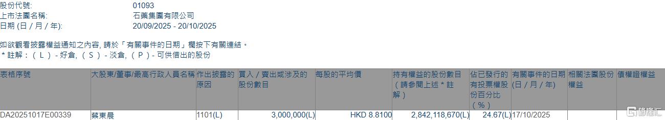 备注:持股数变动有可能因供股、合股、拆股等情况引起,请注意对照实际情况进行辨别。 | 股票名称 | 机构名称 | 性质 | 变动前持股 | 变动后持股 | 持股比 | | --- | --- | --- | --- | --- | --- | | 石药集团(01093) | 蔡东晨 | 好仓 | 28.39 亿股 | 28.42 亿股 | 24.67%(最新) | | | | | | | 24.64%(前次) | 智通财经APP获悉,石药集团(01093)于2025年10月20日进行了最新股东权益披露。 ...