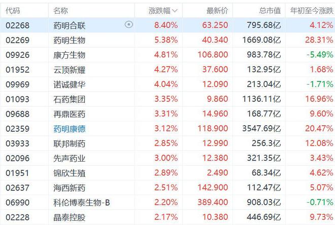 随着近期多只生物医药股靓丽业绩放榜,今日港股创新药概念也集体活跃。其中,入选了2026年格隆 汇"下注中国"十大核心资产名单的药明合联涨超8%,领涨板块,药明生物涨超5%,康方生物、云顶新 耀、诺诚健华涨超4%,石药集团、再鼎医药、药明康德涨超3%。 | 代码 | 名称 | | 涨跌幅 V | 最新价 | 总市值 | 年初至今涨跌 | | --- | --- | --- | --- | --- | --- | --- | | 02268 | 药明合联 | 0 | 8.40% | 63.250 | 795.68亿 | 4.12% | | 02269 | 药明生物 | | 5.38% | 40.340 | 1669.08 Z | 28.31% | | 09926 | 康方生物 | | 4.81% | 106.800 | 983.78亿 | -5.49% | | 01952 | 云顶新耀 | | 4.27% | 37.600 | 132.95亿 | 1.68% | | 69660 | 诺成健华 | | 4.04% | 12.090 | 213.04亿 | -1.71% | | 01093 | 石约集团 | | 3. ...