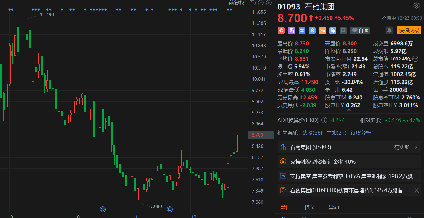 智通财经APP获悉,石药集团(01093)涨超4%,截至发稿,涨4.12%,报8.59港元,成交额4.43亿港元。 消息面上,香港联交所最新资料显示,12月22日,主席兼执行董事蔡东晨增持石药集团1345.4万股,每 股作价8.1957港元,总金额约为1.1亿港元。增持后最新持股数目约为29.1亿股,最新持股比例为 25.26%。 近日,石药集团发布公告,集团开发的SYH2085片已获得中华人民共和国国家药品监督管理局批准,可 在中国开展临床试验。该产品为集团自主研发的化学1类创新药,是一款可抑制流感病毒的RNA聚合酶 酸性蛋白(PA)核酸内切酶活性的新型口服小分子候选药物。本次获批的临床适应症为用于治疗成人及12 岁以上青少年单纯性甲型和乙型流感。 该产品有望成为治疗流感的有效药物,具有较高的临床开发价值,并将进一步丰富集团在抗感染治疗领 域的产品管线。 ...