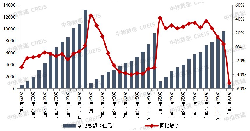 中指研究院:2026年1月重点房企拿地总额579.9亿元 同比下降52.1%