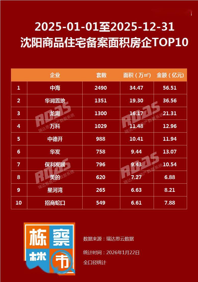 2025年,沈阳精准施策,更好满足居民刚性和改善性住房需求,有效提振购房者信心;组织多场购房活动,持续释放市场潜 力,促进商品房成交。此外,沈阳土地市场再现溢价抢地现象,众多高品质项目扎堆入市,"首开"大捷成常态。 2025年,沈阳哪些房企、哪些楼盘表现抢眼,销量排行榜出炉! 2025年,华润置地中寰悦府、中海·天钻、沈阳星河湾夺得沈阳商品住宅单盘备案面积排行榜前三甲。从榜单来看,曾经刚需唱 主角的楼市,已经被改善型产品所取代,改善型需求已成沈阳楼市"压舱石"。 | | 124 | 貢数 | 面积(万m²) | 金额(亿元 | | --- | --- | --- | --- | --- | | 1 | 奥 | 2490 | 34.47 | 56.51 | | 2 | 依润量瓶 | 1351 | 19.30 | 36.56 | | 3 | 刀不断 | 1300 | 16.17 | 21.31 | | 4 | 用科 | 1029 | 11.48 | 12.96 | | 5 | 中德开 | 988 | 10.41 | 11.94 | | 6 | 华发 | 758 | 9.44 | 13.07 | | 7 | 保利发 ...