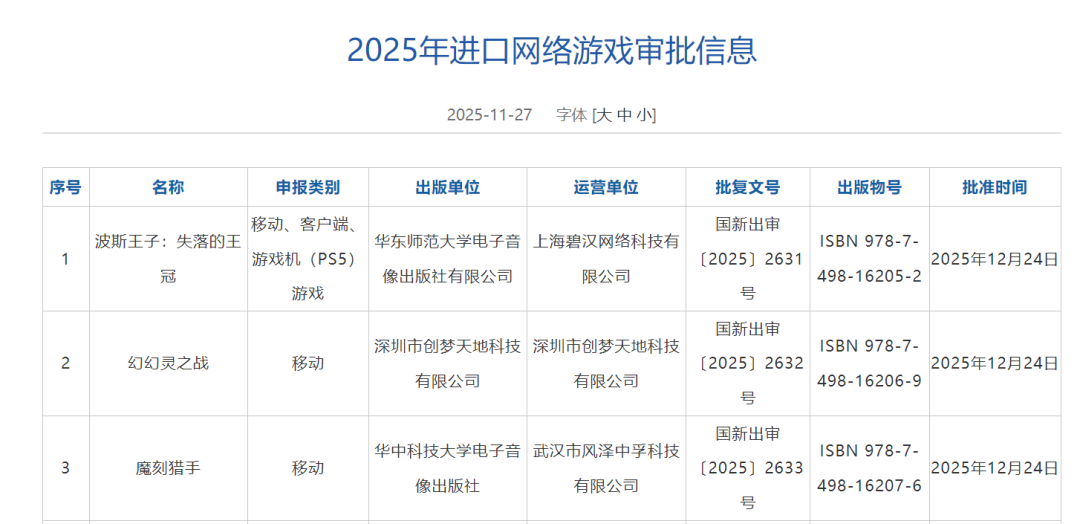 智通财经APP获悉,12月25日,国家新闻出版署发布12月进口网络游戏审批信息,共3款游戏获批,创梦天地(01119)的《幻幻灵之战》、《波斯王子:失落 的王冠》、《魔刻猎手》在列。 | 序号 | 名称 | 申报类别 | 出版单位 | 运营单位 | | --- | --- | --- | --- | --- | | 1 | 波斯王子:失落的王 | 移动、客户端、 游戏机 (PS5) | 华东师范大学电子音 | 上海碧汉网络科技 | | | 冠 | | 像出版社有限公司 | 限公司 | | | | 游戏 | | | | 2 | 幻幻灵之战 | 移动 | 深圳市创梦天地科技 | 深圳市创梦天地利 | | | | | 有限公司 | 有限公司 | | 3 | 魔刻猎手 | 移动 | 华中科技大学电子音 | 武汉市风泽中孚和 | | | | | 像出版社 | 有限公司 | ...