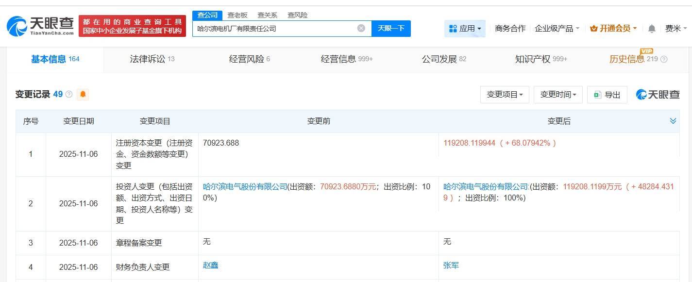 | | | 都在用的商业查询工具 | 章公司 音音板 清米加 育风险 | | | | --- | --- | --- | --- | --- | --- | | | | 国家中小企业发展子基金旗下机构 | 哈尔滨电机厂有限责任公司 | 8 天眼一下 | 脂 应用 · 商务合作 | | 基本信息 164 | | 法律诉讼 13 | 经营风险 6 | 经营信息 999+ | 公司发展 82 知识 | | 要更记录 49 0 0 | | | | | 变更项目 - | | 序号 | 变更目期 | 变更项目 | 变醇前 | | | | 1 | 2025-11-06 | 注册资本变更(注册资 金、资金数额等变更) 恋更 | 70923.688 | | 119208 119944 ( + 68.07) | | 2 | 2025-11-06 | 投资人变更(包括出资 额、出资方式、出资日 期、投资人名称等)变 है | 哈尔滨电气股份有限公司(出资额:70923.6880万元;出资比例:10 0%) | | 哈尔滨电气股份有限公司( 9);出资比例:100%) | | 3 | 2025-11-06 | 章程备案变更 | 无 ...