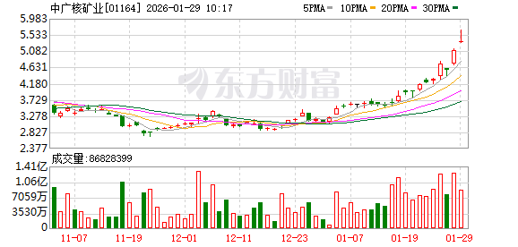 消息面上,中银国际研究报告指出,覆盖的四支天然铀个股年初至今平均涨幅44%,主要受益于现货价 格上涨和金属矿业板块总体的强势。该行预计短期还有数个催化剂可能令投资者情绪进一步高涨,天然 铀的基本面仍然强劲。在连续两年长贸签约量较低后,该行预期2026年的长贸签单会回升,推动现货和 长贸价格冲击历史记录。该行将2026/27年底的天然铀现货价格预期分别上调至120和150美元/磅。 中银国际续指,应留意市场更多潜在催化,哈原工将于2月2日公布其第四季度运营更新以及备受期待的 2026年生产指引,该行目前预测2026年产量将略有增加(+7%),如果实际指引低于预期,市场将变得更 加紧张;2月13日,卡梅科将公布其2025年第四季度业绩,届时市场也将关注其生产指引和市场动态更 新。另一方面,美国战略天然铀储备扩张,进一步的联邦拨款将从市场上买走更多有效供给。此外,美 国政府或同时设置天然铀进口地板价,有利于其国内企业扩大生产。 中广核矿业(01164)午后涨超10%,截至发稿,涨9.21%,报4.98港元,成交额4.02亿港元。 ...