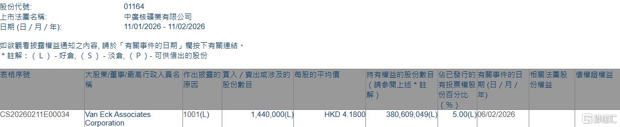 | 表格序號 | 大股東/董事/最高行政人員名 作出披露的 買入 / 賣出或涉及的 每股的平均價 | | | | 持有權益的股份數目 佔已發行的有關事件的日 相關法 | | | --- | --- | --- | --- | --- | --- | --- | | | | | 版分數目 | | 精参闘 上拉 * 註 | 有投票權股期(日/月/ 份權益 | | | | | | | | 一篇章分 上 | | CS20260211E00034 | Van Eck Associates 1,440,000(L | 1001(L) | | HKD 4.1800 | 380,609,049(L) | 5.00(L)06/02/2026 | | | Corporation | | | | | | 增持后,Van Eck Associates Corporation最新持股数目为380,609,049股,持股比例由4.99%上升至5.00%。 | 股份代號: | 01164 | | --- | --- | | 上市法國名稱: | 中廣核礦業有限公司 | | 日期 (日 / 月 / 年): | 11/01/2026 - 11/ ...