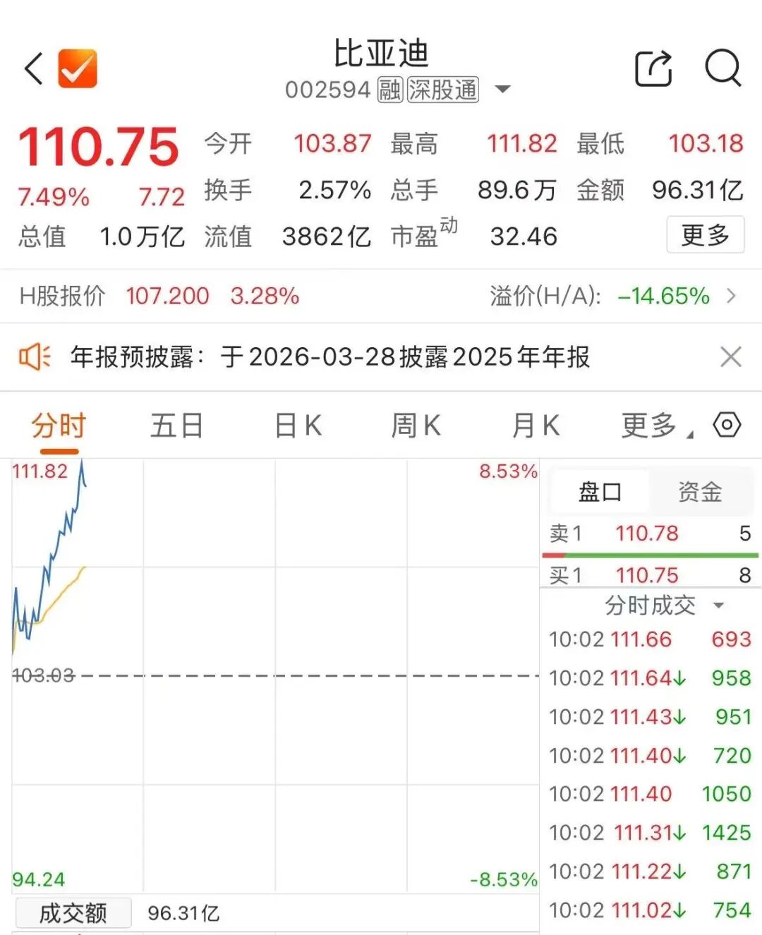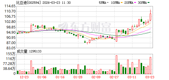 图 片来源:界面图库 3月23日,比亚迪(002594.SZ)开盘即上涨,盘中涨幅一度超8%,公司总市值重回万亿元区间。截至 发稿,比亚迪涨6.58%,报109.81元/股。 消息面上,3月23日晚24点,国内成品油将迎来再度上涨,新能源汽车将迎利好。 据悉,3月23日24时,国内成品油价格将进行第六轮调整,92号汽油预计涨幅将再次突破1.6元/升。目 前国际油价仍显著高于周期内均价,业内人士分析,若国际油价不出现明显下跌,国内油价预计涨幅将 继续扩大。 比亚迪自2022年3月份起停止燃油汽车的整车生产,此后在汽车板块专注于纯电动和插电式混合动力汽 车业务。数据显示,比亚迪2025年全年累计销量4602436辆,同比增长7.73%,其中纯电车型全年累计 2256714辆,同比大增27.86%。 2025年,比亚迪首次在全年电动汽车销量上超越特斯拉,后者2025年全球交付汽车163.6万辆,同比下 降约8.6%,连续第二年交付量下滑。 面对电动汽车市场激烈的竞争,比亚迪今年又发布了最新的电池和补能技术。3月5日,比亚迪发布第二 代刀片电池,该电池从10%到70%的充电速度仅5分钟,从10%到97%的充电速度仅9 ...