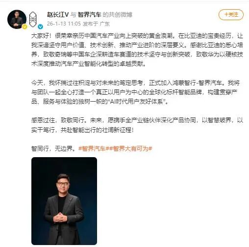 △图源:智界 智界汽车是奇瑞汽车与华为联合推出的智选车品牌,目前有两款汽车在售,首款MPV车型将在近期上市。1月9日,赵长江已开始转发智界品牌的相关宣 传内容。当时就有消息称,赵长江已被任命为奇瑞集团销售常务副总经理,主抓智界品牌的销售工作。 在加入奇瑞汽车之前,赵长江曾在比亚迪工作近16年,历任区域销售经理、比亚迪销售公司总经理、腾势总经理等。2025年10月24日,赵长江宣布从比亚 迪离职,此后就有消息称其将加入奇瑞汽车,负责智界品牌的相关工作。 奇瑞汽车集团对时代周报记者表示,此次任命是智界汽车的任命,并非奇瑞集团的任命,赵长江将负责智界的品牌建设、市场销售等工作。 腾势的"关键先生" 赵长江称得上是一位年富力强的汽车人。 2009年大学毕业之后,赵长江就加入比亚迪的销售体系,曾负责京津等区域、比亚迪等品牌的销售工作。2017年,他已成为比亚迪最年轻的销售公司总经 理,当时年仅31岁。 传闻最终落定。 1月13日,比亚迪旗下品牌腾势的原总经理赵长江宣布加入智界汽车,担任智界汽车执行董事及执行副总裁。"我将与团队一起全心打造一个真正以用户为 中心的全球化标杆智能品牌,构建贯穿产品、服务与体验的独树一帜的' ...