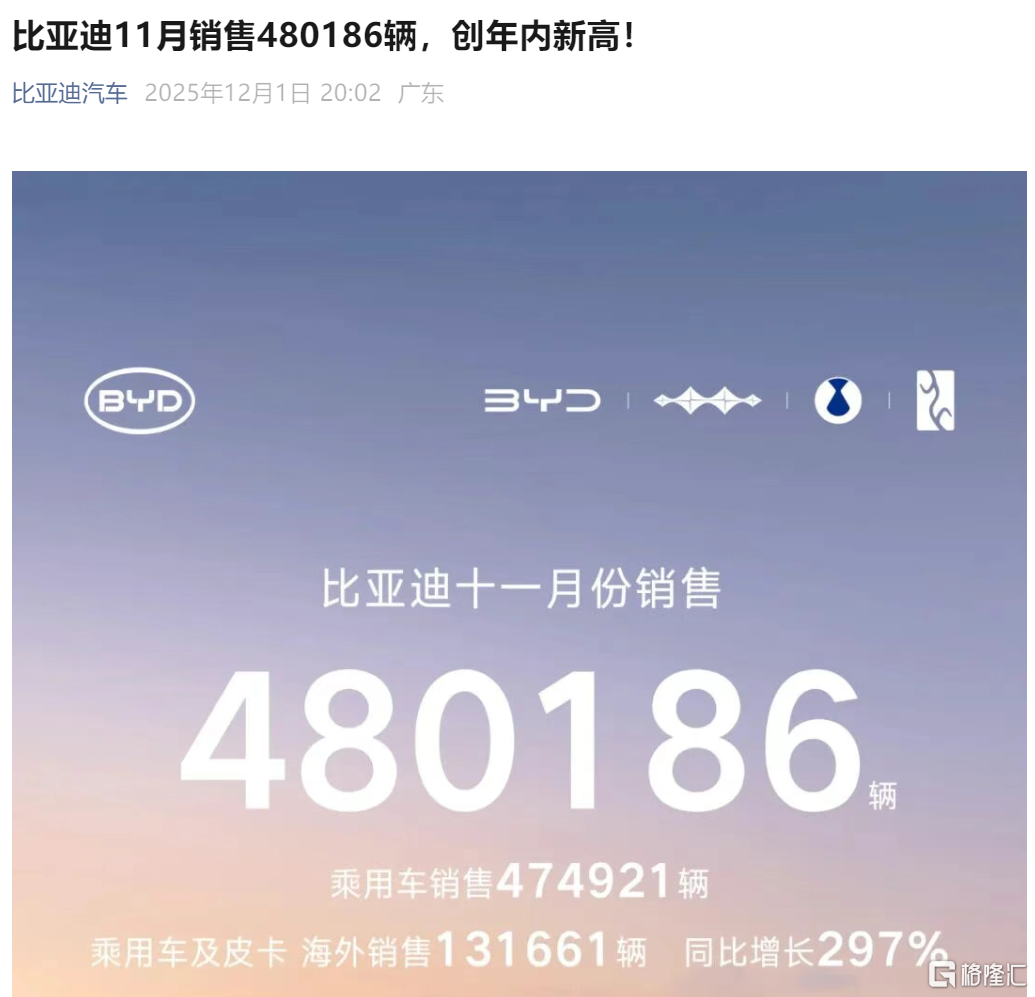 从数据中获悉,比亚迪当月乘用车销量474921辆,其中包含纯电动汽车237540辆、插电式混动汽车 237381辆。比亚迪集团品牌及公关处总经理李云飞表示,11月销量再度创下年内新高;海外销售突破13 万辆,同样创下历史新高。 凤凰网科技讯 12月1日,比亚迪(002594)发布公告:11月汽车销量480186辆,去年同期506804辆。今 年1-11月,汽车销量418万辆,同比增长11.3%。 ...