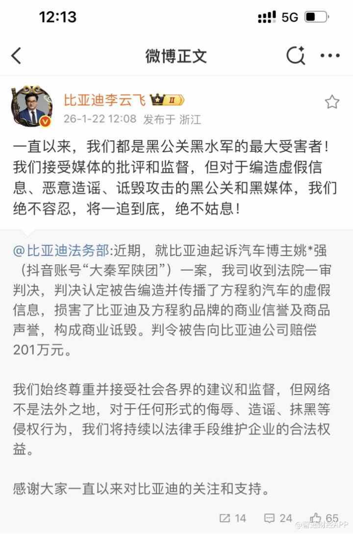 就比亚迪起诉姚*强(抖音账号"大秦军陕团")一案,比亚迪坚持依托法律维护自身合法权益,并于近期公告案件胜诉。1月22日比亚迪法务部发布公告披 露,法院判决认定被告编造并传播了方程豹汽车的虚假信息,损害了比亚迪及方程豹品牌的商业信誉及商品声誉,构成商业诋毁。判令被告姚*强向比亚 迪公司赔偿201万元。随后,比亚迪集团品牌及公关处总经理李云飞转发该公告并表示:"一直以来,我们都是黑公关黑水军的最大受害者!我们接受媒 体的批评和监督,但对于编造虚假信息、恶意造谣、诋毁攻击的黑公关和黑媒体,我们绝不容忍,一追到底,绝不姑息!" 此前在公开活动中,李云飞也曾明确立场:"比亚迪到了现在的位置和体量,如果有媒体就客观事实进行报道批评,都没问题!有些媒体不了解情况,有 些误解性的发布,我们也能接受!但对于黑公关、黑媒体,为了黑而黑,长期针对比亚迪,诋毁比亚迪,我们绝不容忍!" 2023年12月,方程豹豹5上市之际,姚*强通过抖音账号"大秦军陕团"发布视频,声称以正常驾驶方式测试方程豹旗下车型豹5,得出百公里油耗18升的结 论,在网络上引起了大范围的关注及讨论。之后应警方调查取证需要,比亚迪调取数据显示:测试当日车辆存在大量异 ...