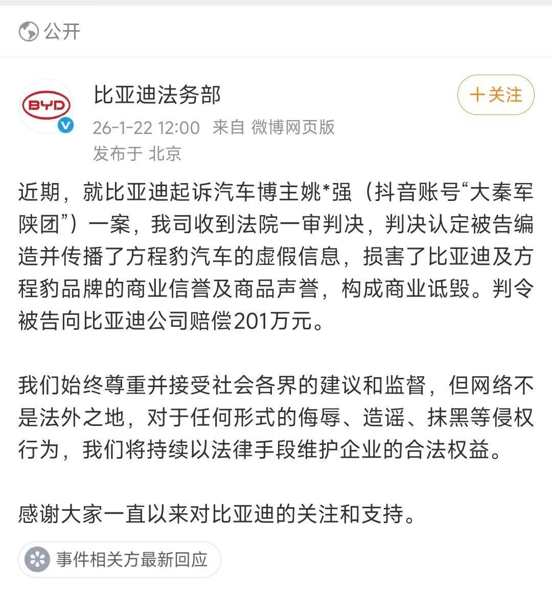 比亚迪李云飞转发并回应称:"一直以来,我们都是黑公关黑水军的最大受害者!我们接受媒体的批评和监 督,但对于编造虚假信息、恶意造谣、诋毁攻击的黑公关和黑媒体,我们绝不容忍,将一追到底,绝不姑 息!" 1月22日,比亚迪(002594)法务部发文表示,就比亚迪起诉汽车博主姚*强(抖音账号"大秦军陕团")一 案,公司近期收到法院一审判决,判决认定被告编造并传播了方程豹汽车的虚假信息,损害了比亚迪及方程 豹品牌的商业信誉及商品声誉,构成商业诋毁。判令被告向比亚迪公司赔偿201万元。 比亚迪方面表示,始终尊重并接受社会各界的建议和监督,但网络不是法外之地,对于任何形式的侮辱、造 谣、抹黑等侵权行为,将持续以法律手段维护企业的合法权益。 判决认定:被告发表针对比亚迪公司旗下方程豹品牌车型的贬损言论,诋毁方程豹品牌车型商品声誉,构成 对比亚迪名誉权的侵害。 图片来源 比亚迪李云飞微博截图 此前,比亚迪诉"王悟空说车"网络侵权责任纠纷案胜诉。 2025年11月20日,据@比亚迪汽车法务部,近期,就比亚迪起诉"王悟空说车"及相关账号网络侵权责任纠纷 一案,我司收到法院判决,判令被告在《人民法院报》向比亚迪公司公开道歉并支付赔偿 ...