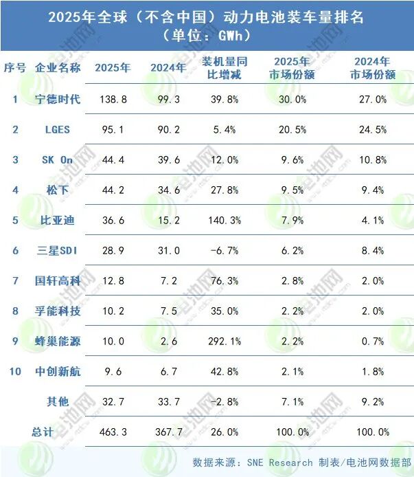 Core Insights - The global lithium-ion energy storage battery shipment reached 550 GWh in 2025, marking a 79% year-on-year increase, indicating rapid expansion in the energy storage industry [1][6][11] Group 1: Market Overview - China, North America, and Europe remain the primary target markets, with China accounting for 352 GWh (64% of global shipments) and a growth rate of 117%, highlighting its role as the core driver of global energy storage supply growth [1][6][11] - North America and Europe are experiencing growth, but their global market share is declining due to faster growth in China and emerging markets, which saw a growth rate of 108% [1][6][11] Group 2: Regional Dynamics - The slowdown in North America's growth rate and its declining global share is linked to U.S. policies, particularly high tariffs on Chinese products, which have impacted the supply of lithium iron phosphate batteries [7][10] Group 3: Company Rankings - The top nine companies in lithium-ion energy storage battery shipments are dominated by Chinese firms, with CATL leading at 167 GWh, holding a 30% market share, while the last two Korean companies account for only 4% [4][9][11] - The dominance of Chinese companies is attributed to the suitability of lithium iron phosphate batteries for energy storage needs, emphasizing safety and cost over energy density [4][9][10] Group 4: Future Outlook - Korean companies are adapting by modifying existing U.S. production lines and focusing on lithium iron phosphate technology to regain market share in North America, with expectations of a gradual recovery in their market presence [10]