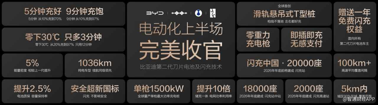不同于其他新能源车企在发布新产品时,倾向于与行业一流产品进行"横向比较",在3月5日比亚迪举行 的"闪充中国,改变世界"发布会,比亚迪的"掌门人"王传福一直在分享他对另一个维度的思考:"新能 源汽车该如何更好地取代油车?" 在发布会上,王传福没有宏大的叙事,而是提出了他的困惑,"一些新能源车明明续航能力已经超过了 油车,为何公众对于新能源汽车依旧充满'里程焦虑'"。他分享了他在调研过程中听到的"吐槽":大 到"电动车北方不友好"、"假日难出行",小到"充电枪笨重"、"充电线太脏",他认为,充电体验始终是 制约行业大规模普及的"最后一公里"的痛点。 但这一切可能会因为比亚迪发布的第二代刀片电池和闪充技术彻底改变。这项技术不仅标志着电池技术 与充电技术的深度融合突破,更以其卓越的性能指标和战略高度,被认为将为全球电动化进程注入了强 劲动力。 "第二代刀片电池常温充电从10%到70%只用5分钟,到97%只用9分钟;零下30度极寒环境下,从20%到 97%充电也少于12分钟,从今天开始,让'电车不过山海关'永远成为历史!"王传福称。 助推全球电动化产业升级 从技术指标来看,比亚迪闪充技术在充电功率、能量转化率及安全性 ...