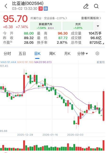 3月2日午后,比亚迪成交额达100亿元,现涨7.27%。 这一成绩不仅印证了比亚迪在新能源领域的技术优势,也为中国汽车品牌出海提供了新的范本。推动中国汽车产业从产品输出向品牌输出升级。 从细分数据来看,2月乘用车销售187782辆,王朝与海洋系列贡献165013辆,方程豹、腾势、仰望分别交付17036辆、5501辆、232辆。 2026年1-2月,集团累计销售400241辆,海外累计销量突破20万辆,新能源累计销量超1550万辆。 海外销量反超国内,是比亚迪全球化战略的重要成果。在东南亚、拉美、欧洲等核心市场,比亚迪凭借丰富的产品矩阵和本地化运营,持续提升品牌影响 力。 消息面上,比亚迪昨日公布2月销量数据,单月销量达190190辆,其中海外销量首次超越国内,达到100151辆,同比增长41.4%。 ...